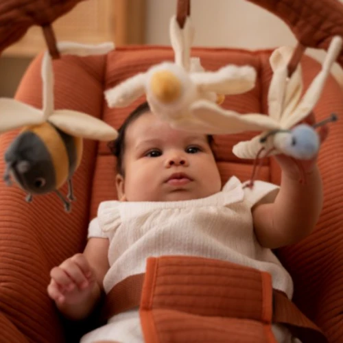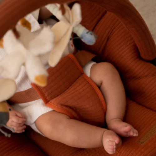 The two straps will secure your baby in the chair. And the play bow will keep your baby entertained thanks to the three small toys from the Little Goose collection. Delivered with a soft and comfortable reduction cushion for the first couple of months. The backrest and the footrest can be individually adjusted in different positions and are well padded for extra sitting and lying comfort. The bouncing chair is suitable from birth up to 6 months and max 9 kg. The black frame gives the chair a stylish look