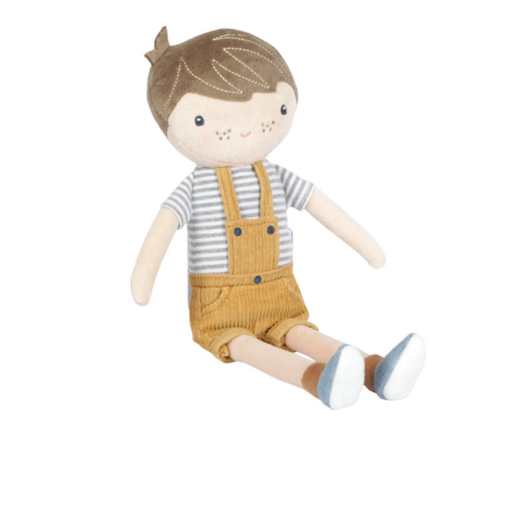 Jim the cute plush cuddle doll in their cool dungarees is soft and lovely to cuddle with. They can sit up and likes to go with you in the Little Dutch wooden doll stroller.