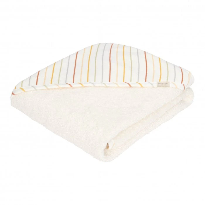 The Little Dutch hooded towel can be used as a towel or swaddle and is made from high-grade terry cloth that feels really comfortable. It is perfect for swaddling your baby in after a bath. The soft hood keeps your child’s head nice and warm. This one from the Vintage Sunny Stripes collection features a beautiful vintage striped design. The edge of the hooded towel features a border of the print.Â