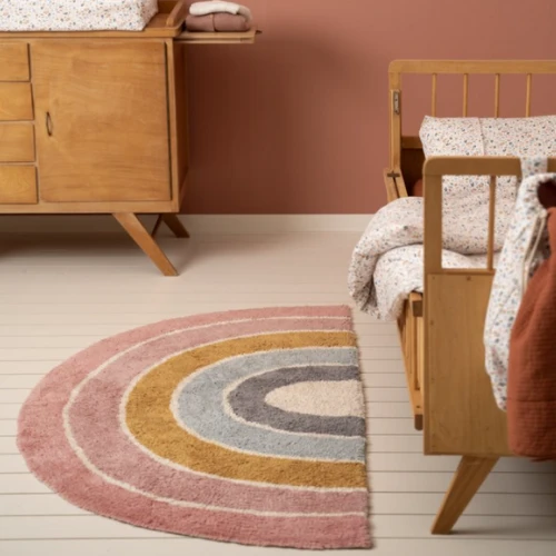 Add a touch of style to the nursery or children’s room with this beautiful hand-made rainbow rug! This rug, shaped as a rainbow, is a semi-circle of 80 by 130 cm in size.