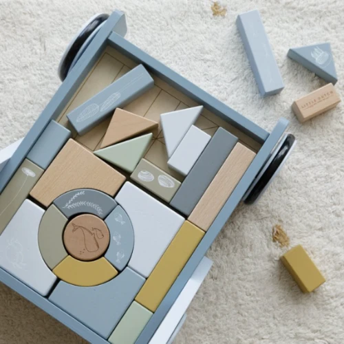 The block trolley is equipped with wooden wheels and filled with coloured wooden blocks featuring beautiful drawings from the Ocean collection such as a whale, shells and water plants. The different sizes of the blocks promotes children’s recognition of colours and shapes. The handle is at the right height for toddlers to walk around the room. This trolley filled with blocks guarantees hours of building fun.