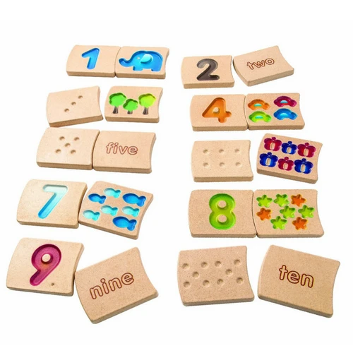 This 20-piece wooden tile set makes learning numbers as easy as 1-2-3! The two-sided tiles feature number 1-10 colorful pictures and words that help children count match spell and trace the numbers.