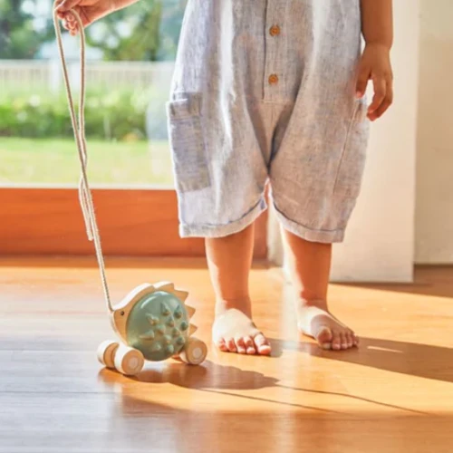 The Pull-Along Hedgehog is ready to accompany your little one everywhere they go! When pulled, the hedgehog will let out a chime as a reminder that it’s not far behind. Available in two colors, this toy encourages children to develop gross motor skills, balance, and coordination.