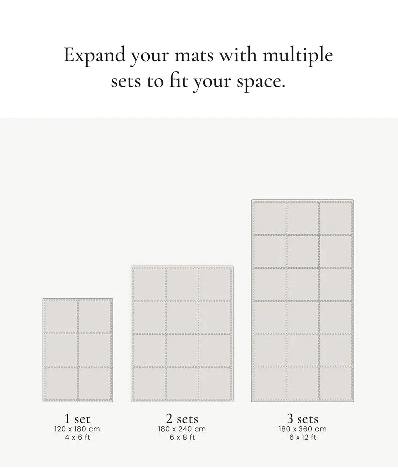 - One assembled mat is sized at 120x180cm/4x6ft but the possibilities for sizing are endless ā simply attach multiple tiles together to find a size that fits your space.