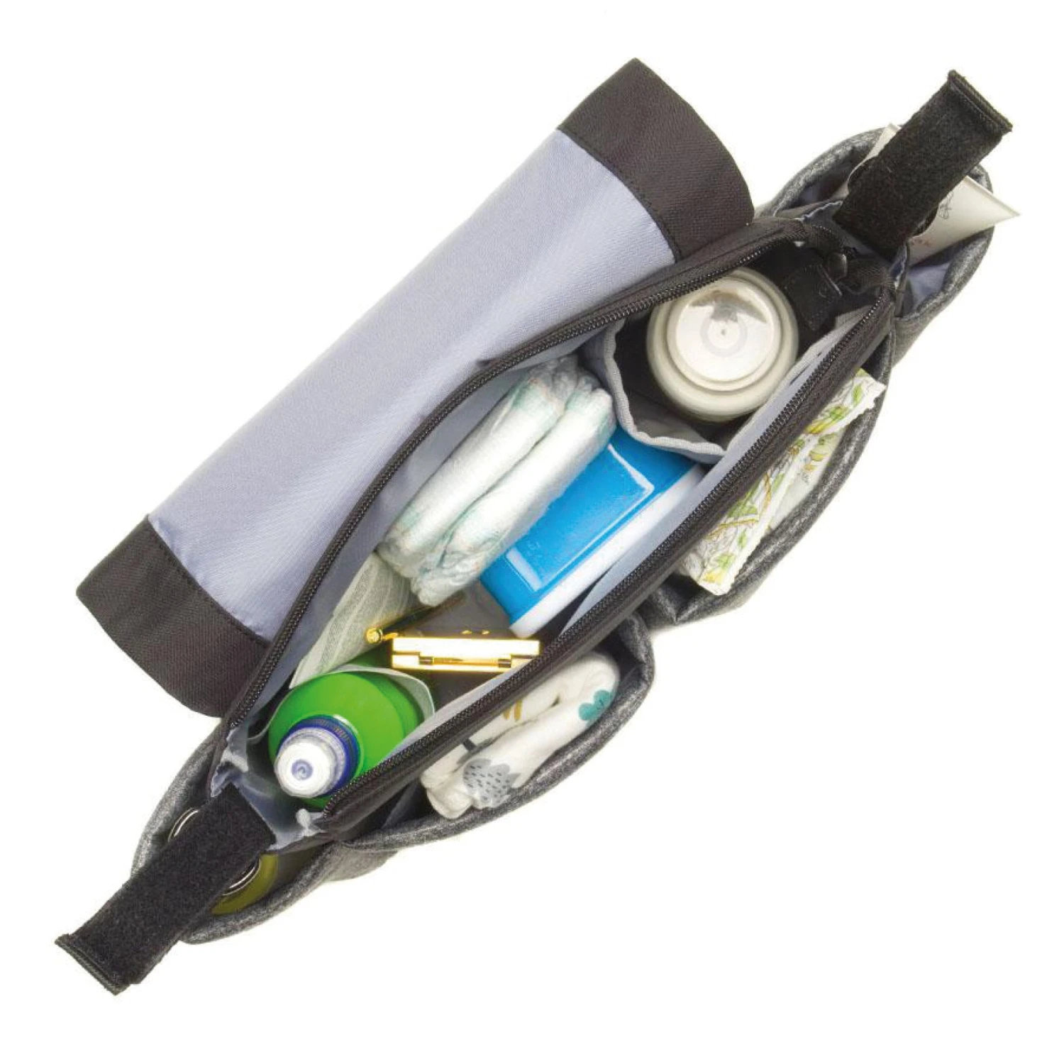 A refined way to stow all your daily essentials on your stroller. Crafted from durable, water-resistant scuba material, complemented with statement hardware details. This accessory is a universal fit to most stroller bars and handles.