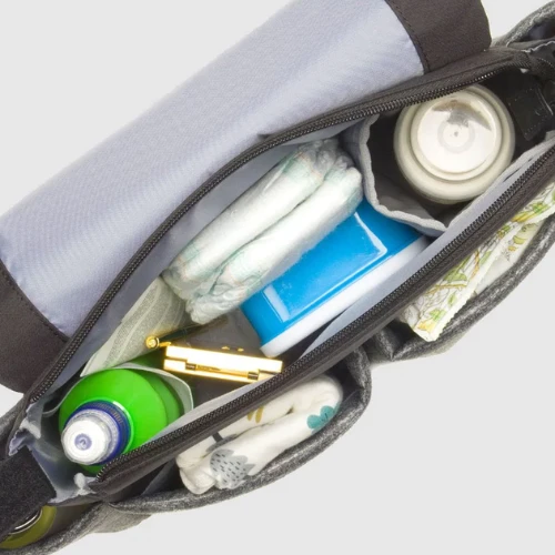 A refined way to stow all your daily essentials on your stroller. Crafted from durable, water-resistant scuba material, complemented with statement hardware details. This accessory is a universal fit to most stroller bars and handles.