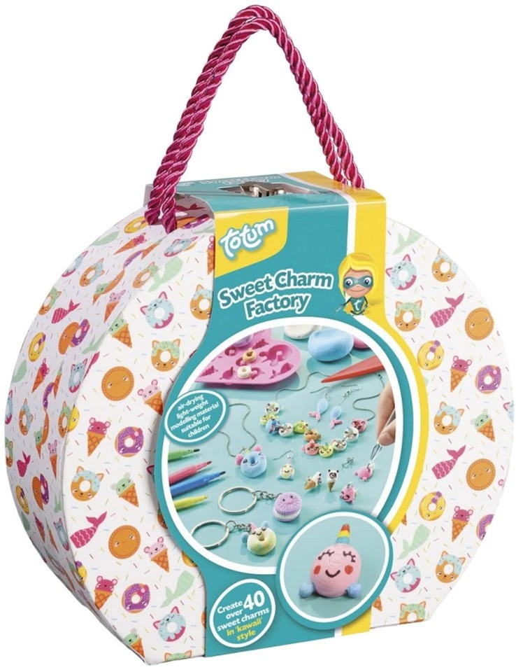 Craft and decorate beautiful Accessories! With Totum you can make your own trendy accessories! First you make cheerful figures, then you make jewelry and key rings! The craft set comes with 4 colors of air-drying malleable material, silicone molds, 4 earrings, 4 stud earrings, 2 metal key rings, 2 ball chains, a thin marker and 4 colored markers. The material with which you make the figures is very suitable for children: it is a kind of clay that you knead into a shape in the molds. With the ‘Totum Make your own Trendy Accessories’ you can make jewelry and key rings with, among other things, unicorn donuts, ice creams and fish. Comes in a colorful round case with rope handle